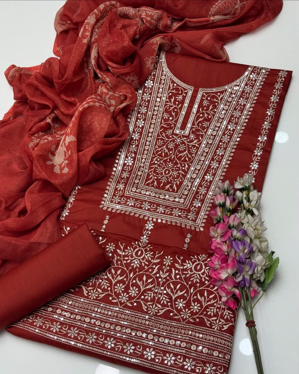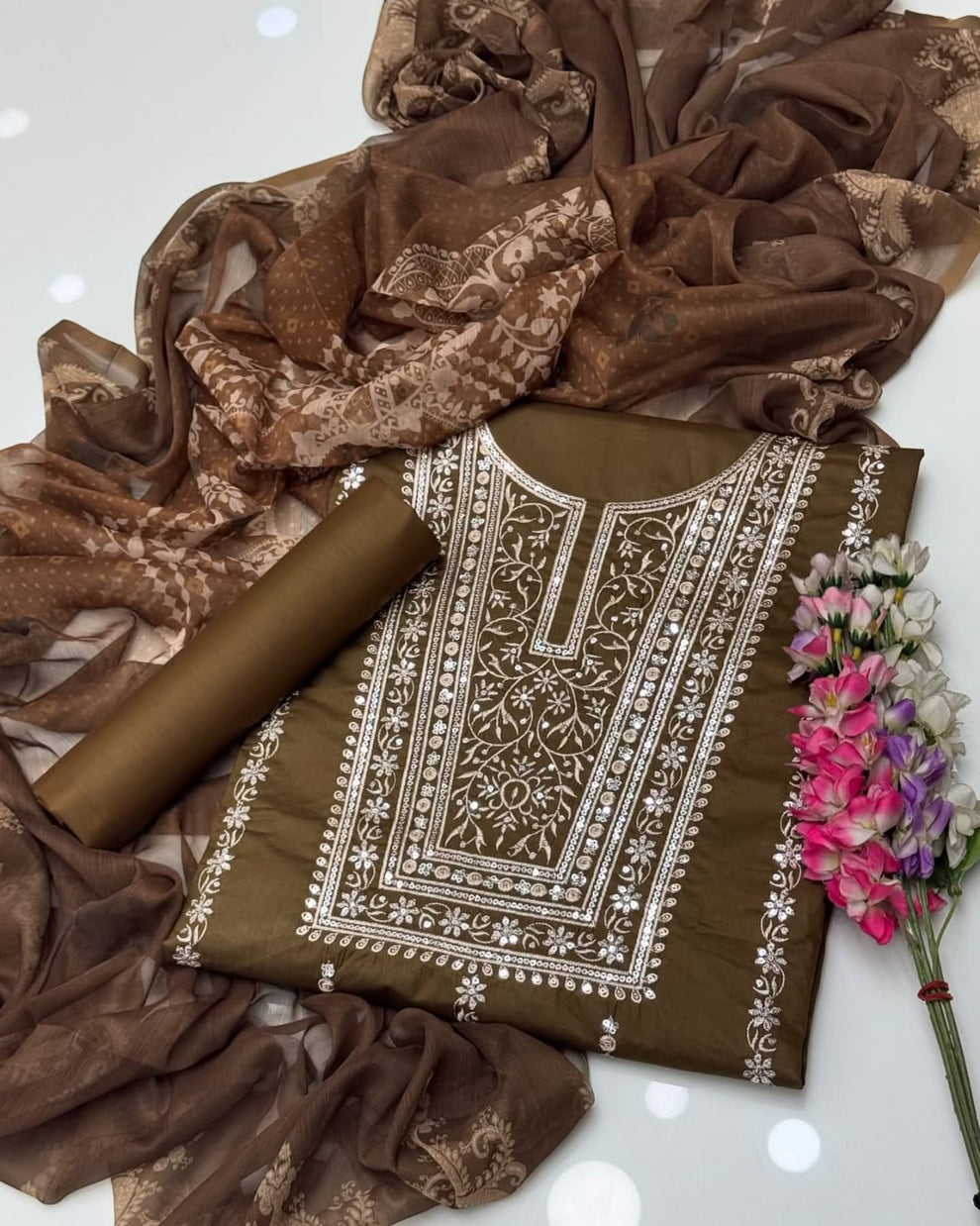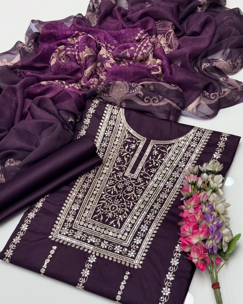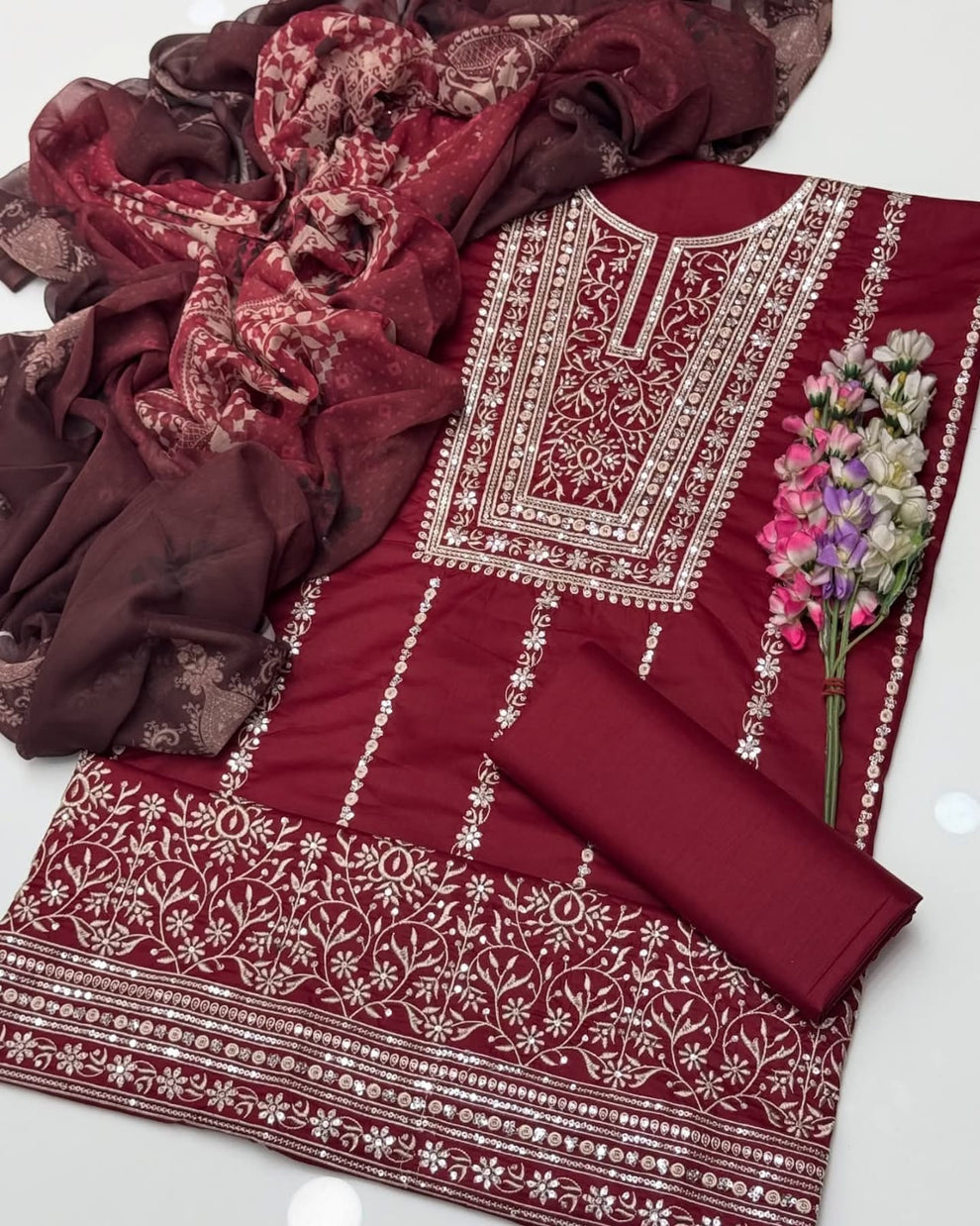Fancy Sequence Bareeze Thread Embroidery ๐งต Lawn Shirt & lawn plan Trouser With Digital Printed Chiffion Duppata 3 Pc Dress ๐