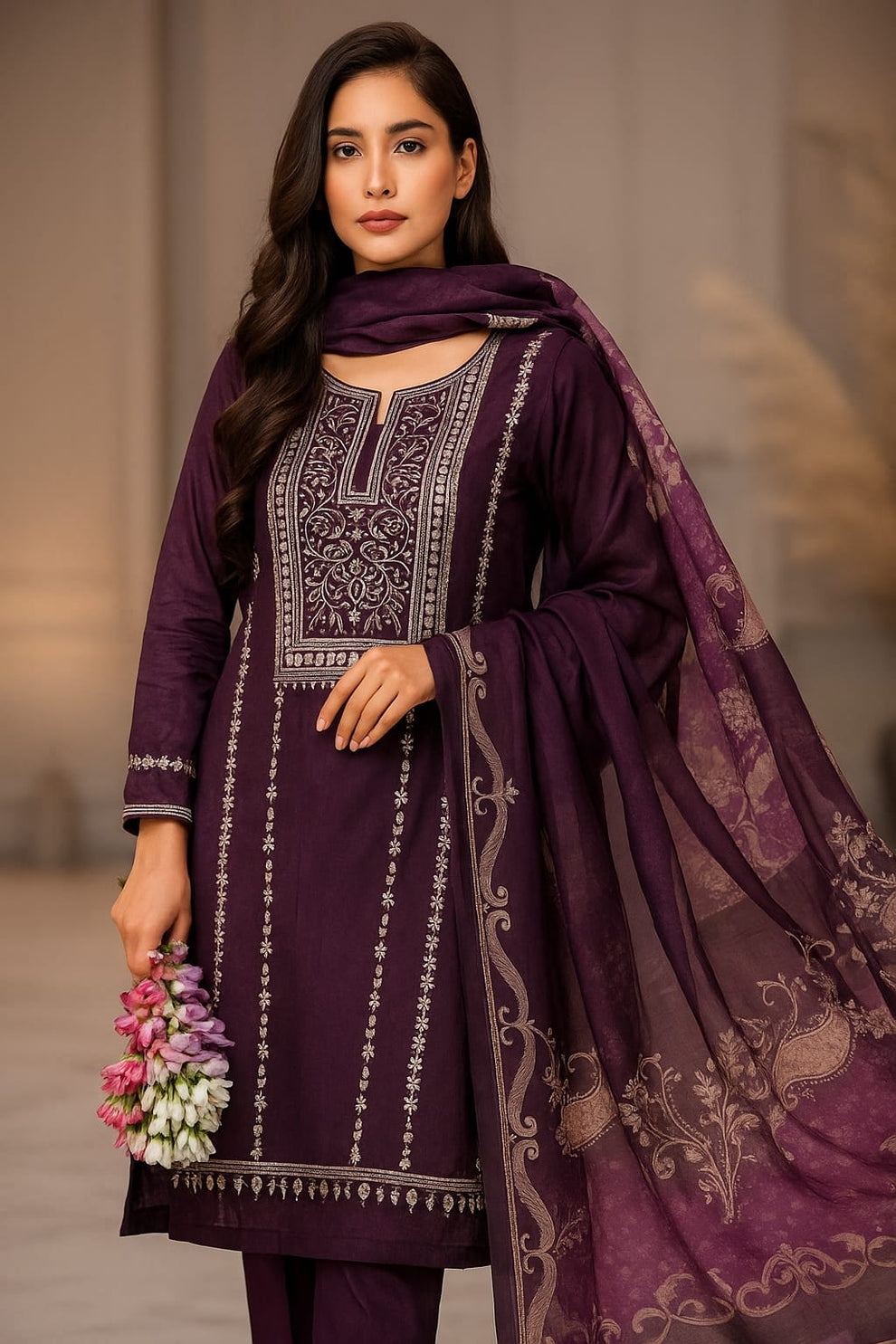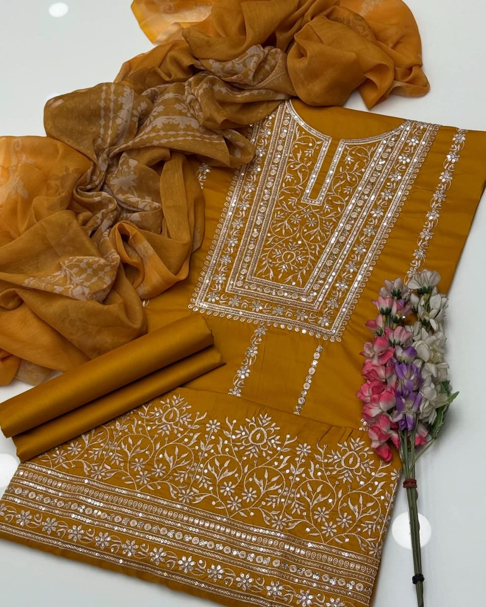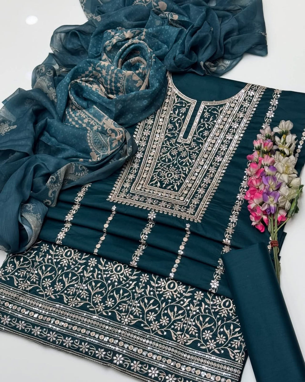 Fancy Sequence Bareeze Thread Embroidery ๐งต Lawn Shirt & lawn plan Trouser With Digital Printed Chiffion Duppata 3 Pc Dress ๐