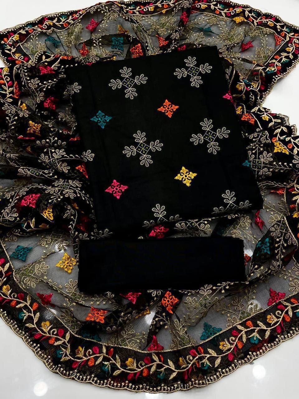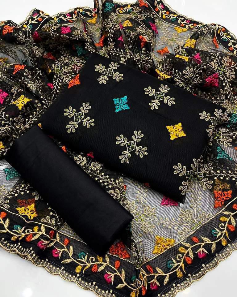 Shirt linen all over embroidery full jaal and trouser linen plan duppta shafoon full jaal pulkari embroidery 4 side 3pc dress price