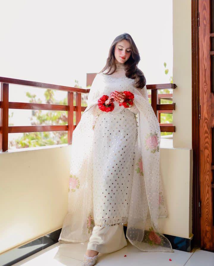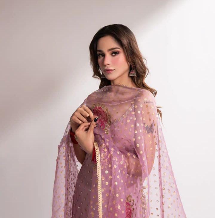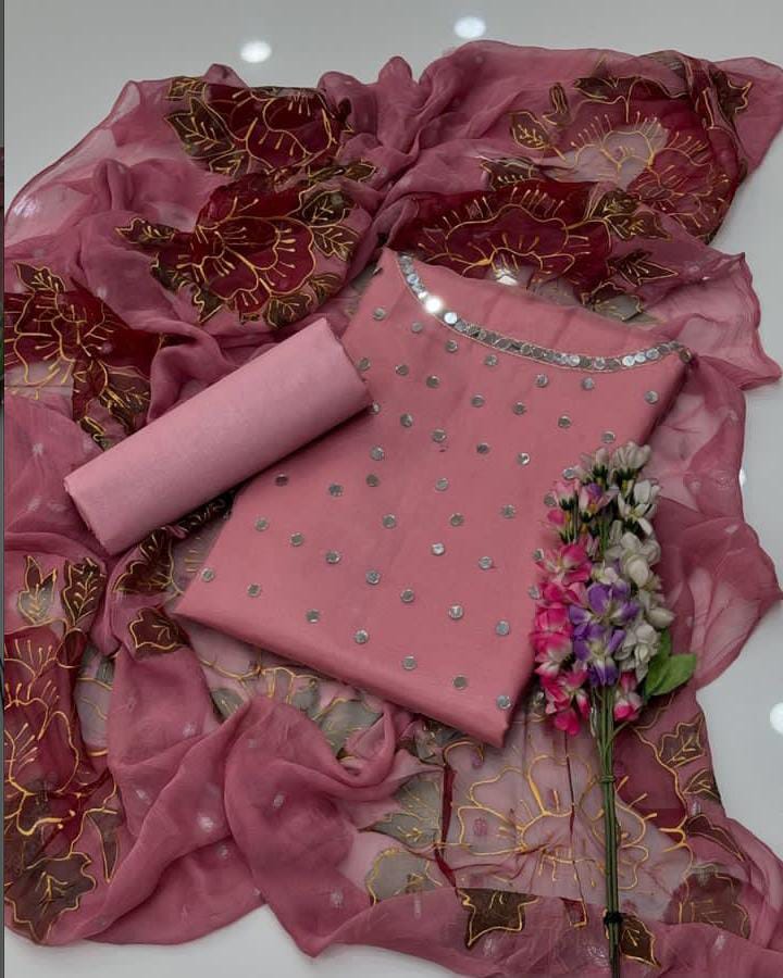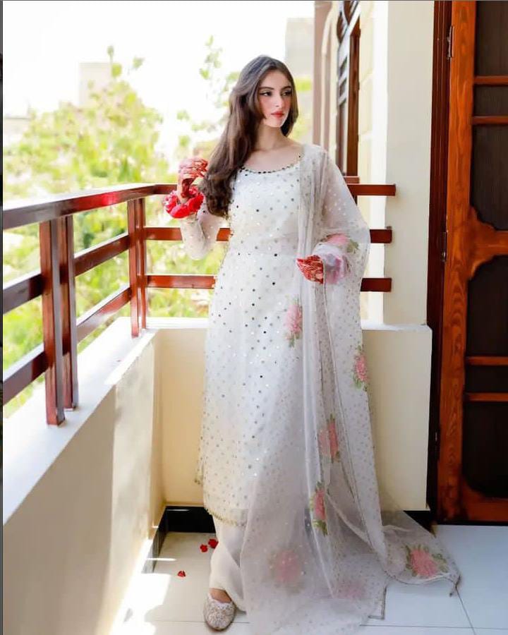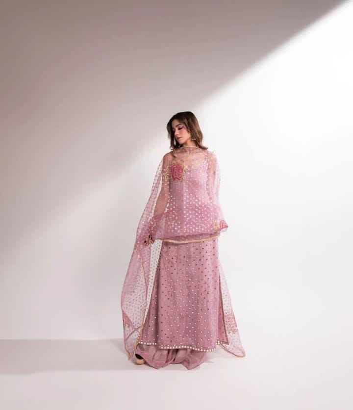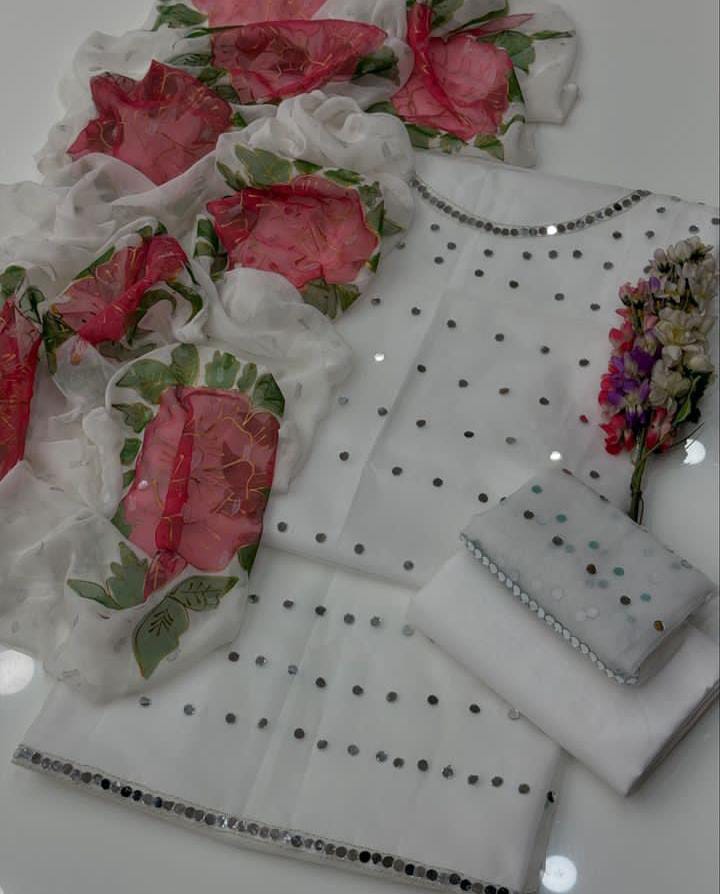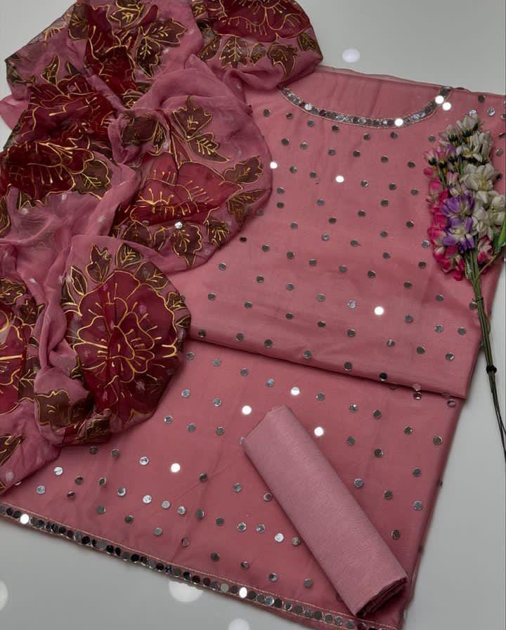 β Pure Organza Fabric β Fully embellished with authentic mirror work on shirt & sleeves