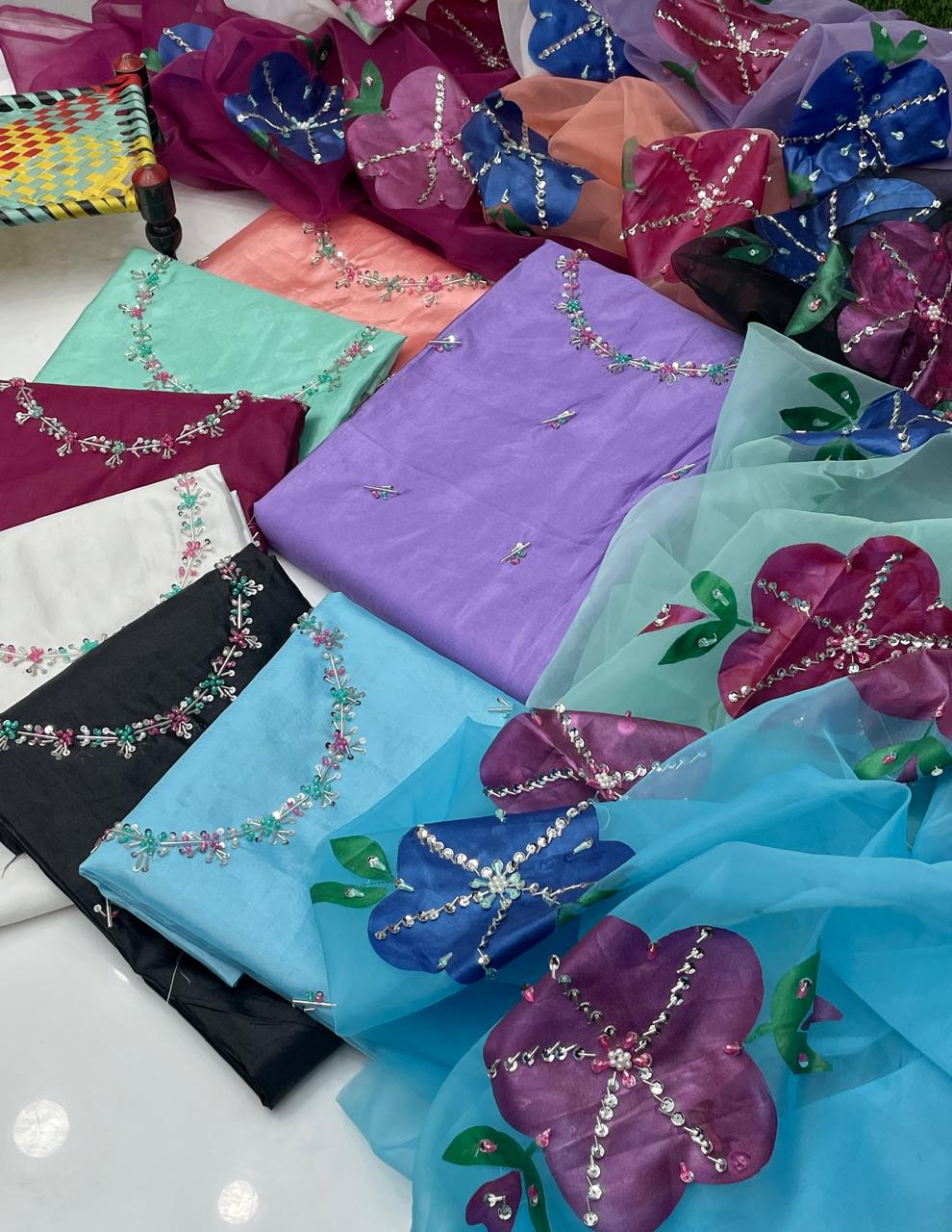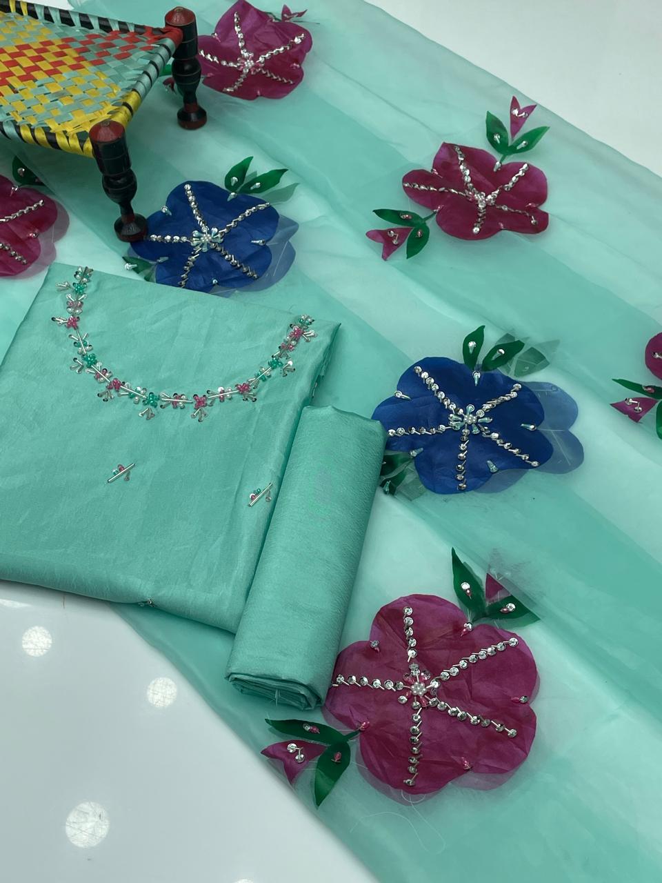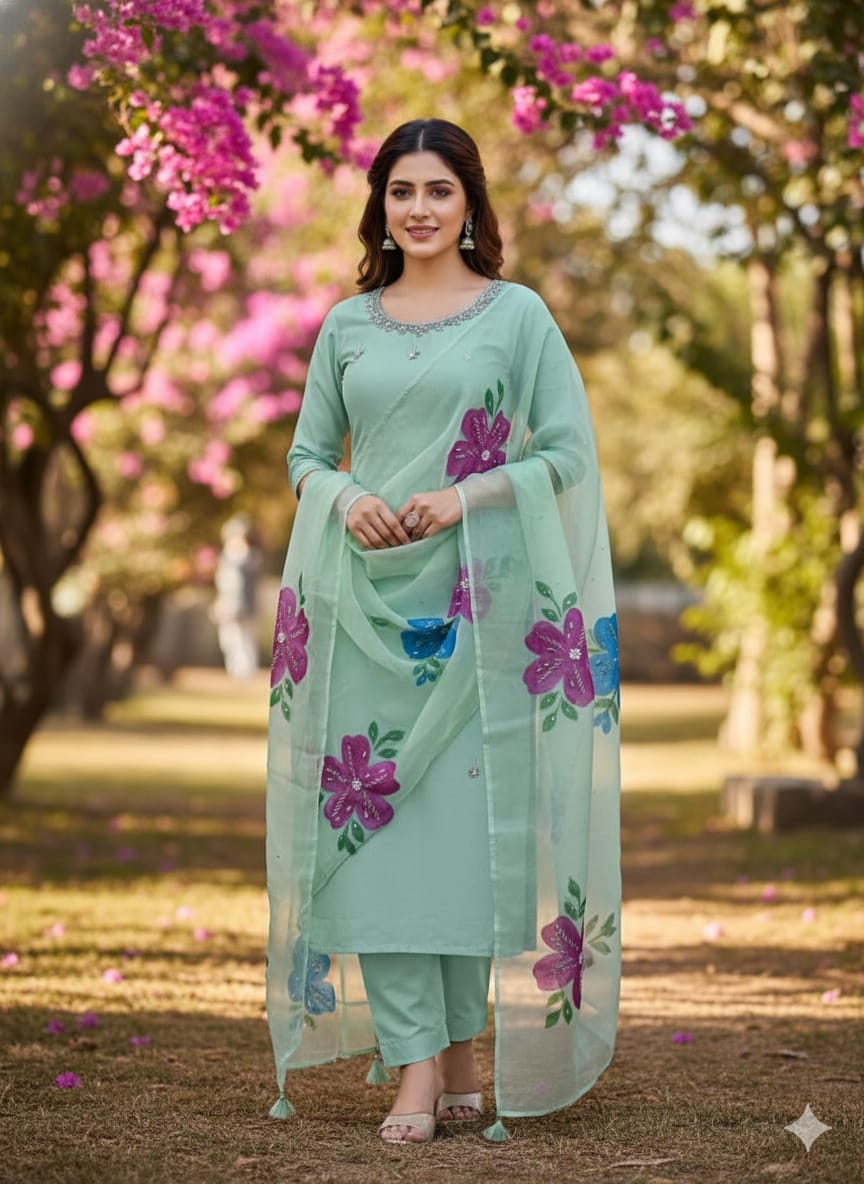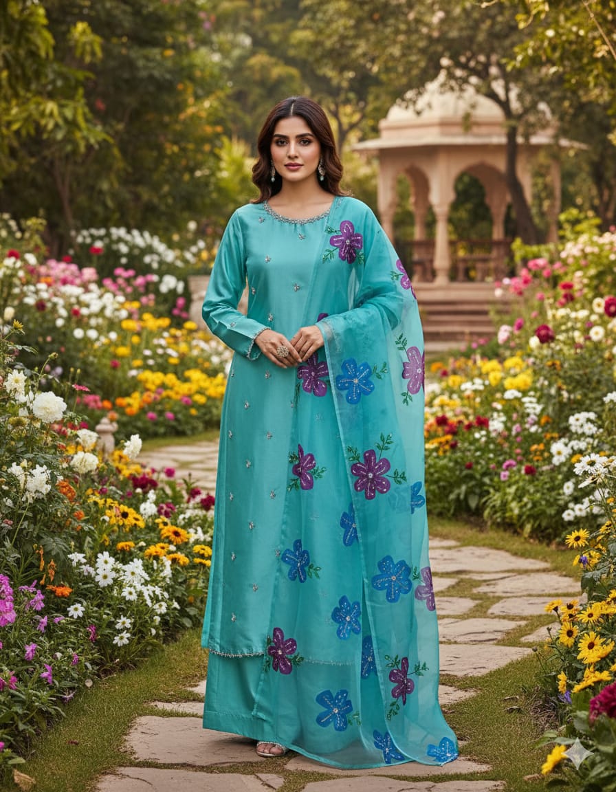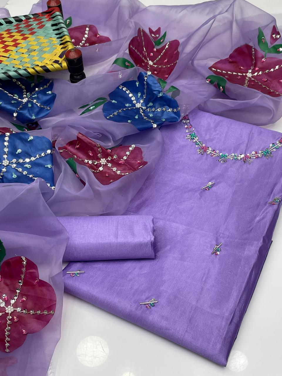 ✨ Indian Organza Dupatta with Handwork, Brush Painting & Zari Detailing (13 Bunches)